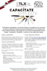 El Instituto Tlaxcalteca de la Juventud (ITJ) convoca a las mujeres jóvenes tlaxcaltecas de entre 14 y 30 años de edad que sean madres solteras, a participar en los cursos de capacitación para el trabajo “Capacítate-Empléate” que se impartirán con la finalidad de contribuir a mejorar su calidad de vida.