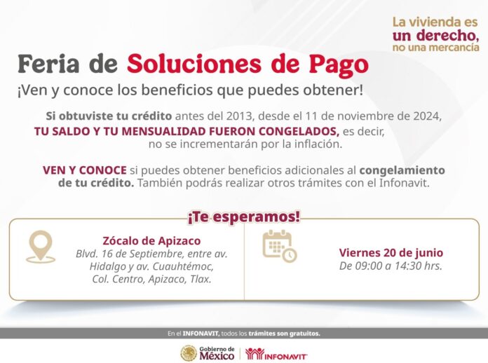 El Gobierno municipal de Apizaco en coordinación con el Instituto del Fondo Nacional de la Vivienda para los Trabajadores (Infonavit) en Tlaxcala, invita a las y los derechohabientes del municipio a participar en la Feria de Soluciones de Pago, un evento diseñado para brindar apoyo a personas con créditos activos.