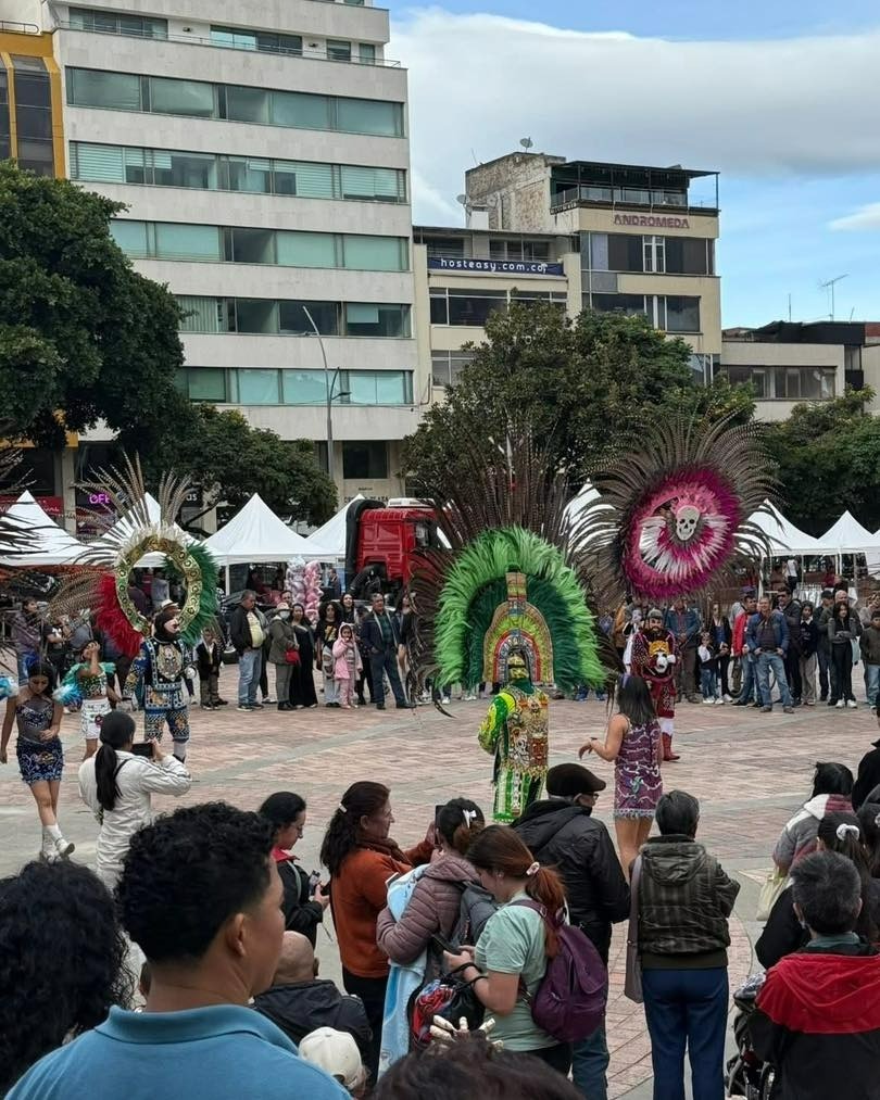 Durante el desfile conmemorativo del Día Nacional de la Independencia de Colombia, la camada internacional de huehues de San Francisco Tlacuilohcan desfiló por la Plaza de los Libertadores, cautivando al público con su tradicional danza, vestimenta de pluma y la historia del carnaval tlaxcalteca.