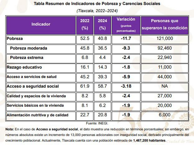 Las cifras provenientes de la medición oficial del INEGI confirman que las políticas implementadas por el Gobierno del Estado en el periodo 2022–2024 generaron resultados medibles y verificables, ya que Tlaxcala logró una reducción en todos los indicadores de carencias sociales y en los tres niveles de pobreza, lo que corrobora un avance integral en materia de bienestar social, resultado de estrategias integrales y acciones de política social con impacto directo en las familias tlaxcaltecas.