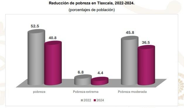 Como resultado de las políticas impulsada por la administración encabezada por la gobernadora Lorena Cuéllar Cisneros, que priorizan el bienestar social, la reducción del rezago y la atención a la marginación, la población en situación de pobreza en el Estado de Tlaxcala disminuyó en 11.7 puntos porcentuales de 2022 a 2024.