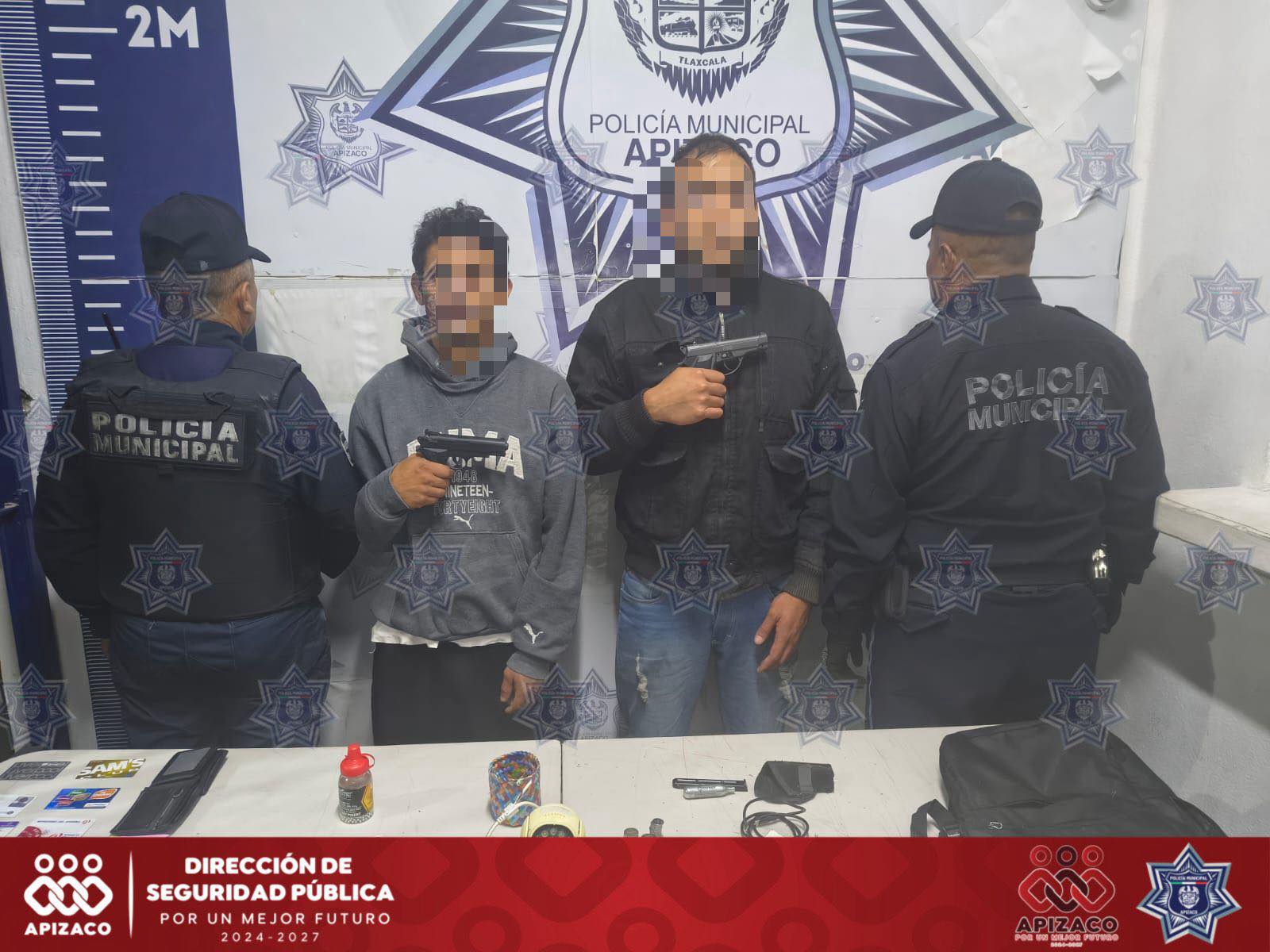 Durante la inspección preventiva se aseguraron dos armas de fuego (réplicas), una mochila con tres teléfonos celulares y una cartera. Los detenidos fueron informados de sus derechos, y trasladados a la Dirección de Seguridad Pública, Vialidad y Transporte de Apizaco. Posteriormente, quedaron a disposición de la Fiscalía General de Justicia del Estado de Tlaxcala para determinar su situación jurídica.