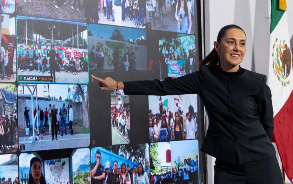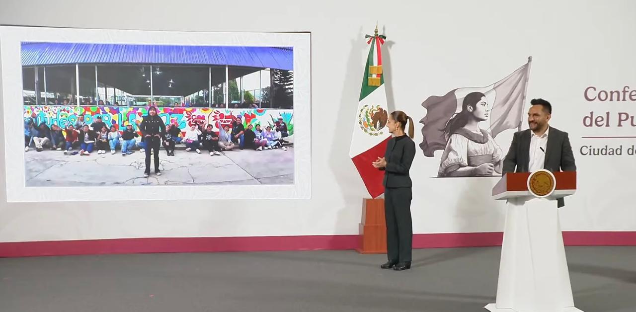 En un enlace realizado en la conferencia matutina “La Mañanera del Pueblo”, jóvenes tlaxcaltecas informaron a la titular del Ejecutivo y al director del Instituto Mexicano de la Juventud (IMJUVE), Abraham Carro Toledo, sobre la creación del Mural de la Paz en la comunidad de San Jorge Tezoquipan del municipio de Panotla, uno de los 45 tlaxcaltequios que han sido rehabilitados en diversos municipios del estado, con el propósito de ofrecer espacios de recreación, convivencia y seguros.