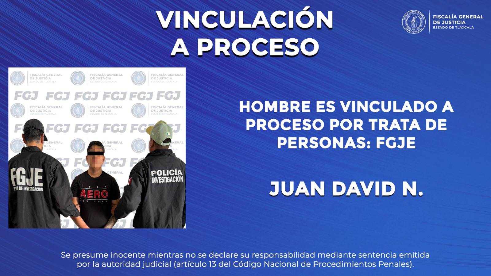 Como resultado del trabajo realizado por el Ministerio Público, la Fiscalía General de Justicia del Estado (FGJE) logró la vinculación a proceso en contra de Juan David N., por el delito de trata de personas.