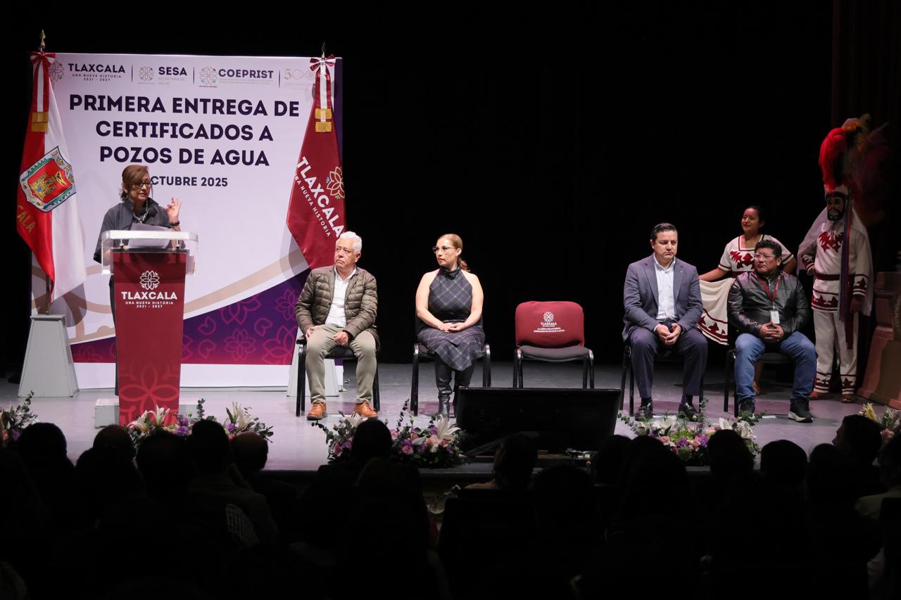 La gobernadora Lorena Cuéllar Cisneros encabezó la entrega de certificados de calidad del agua a presidentas y presidentes de 59 municipios, con lo cual Tlaxcala se consolida como la primera entidad del país en certificar 190 sistemas de abastecimiento público, garantizando agua limpia y segura para uso y consumo humano.
