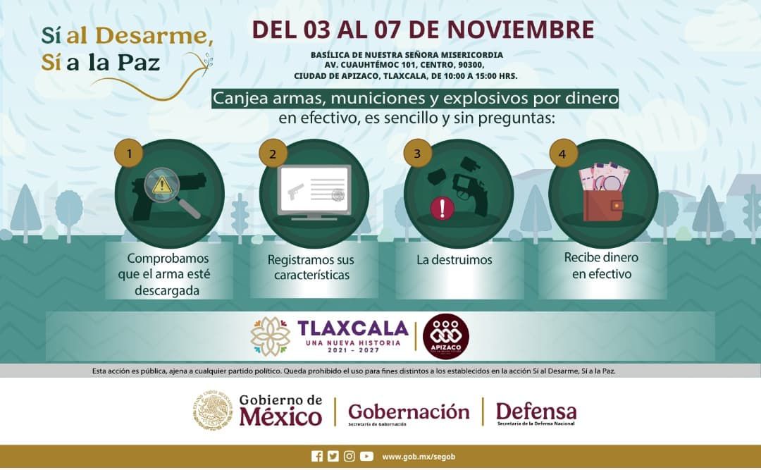El Gobierno de Apizaco, encabezado por el presidente municipal Javier Rivera Bonilla, invita a las familias apizaquenses a sumarse a la campaña “Sí al Desarme, Sí a la Paz”, iniciativa del Gobierno de México a través de la Secretaría de Gobernación y la Secretaría de la Defensa Nacional (Defensa), en coordinación con el Gobierno del Estado de Tlaxcala.