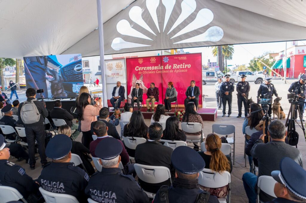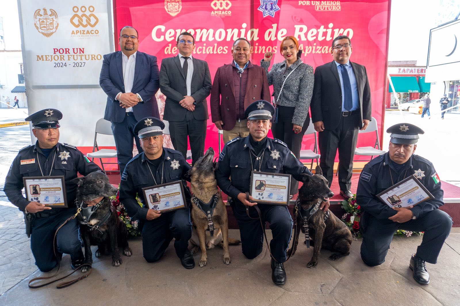 La Dirección de Seguridad Pública, Vialidad y Transporte de Apizaco rindió un emotivo homenaje a tres oficiales caninos que, después de nueve años de servicio ininterrumpido, concluyeron su honorable labor al servicio de la ciudadanía.