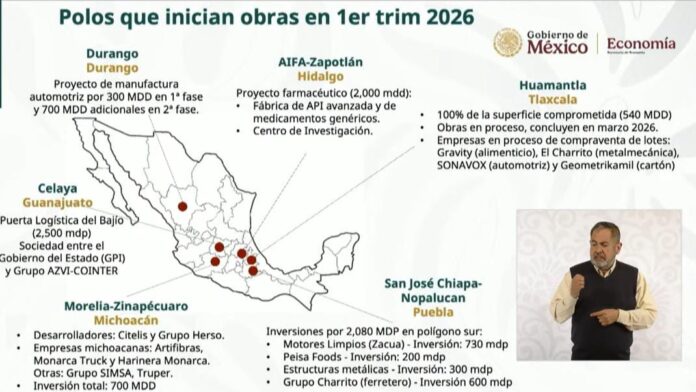 Ebrard Casaubón recordó que el Gobierno de México impulsa 15 Polos de Desarrollo para el Bienestar en distintas regiones del país, como parte de una estrategia nacional orientada a detonar la inversión productiva, fortalecer capacidades locales y promover un desarrollo regional equilibrado, mediante infraestructura, incentivos fiscales y facilidades administrativas.