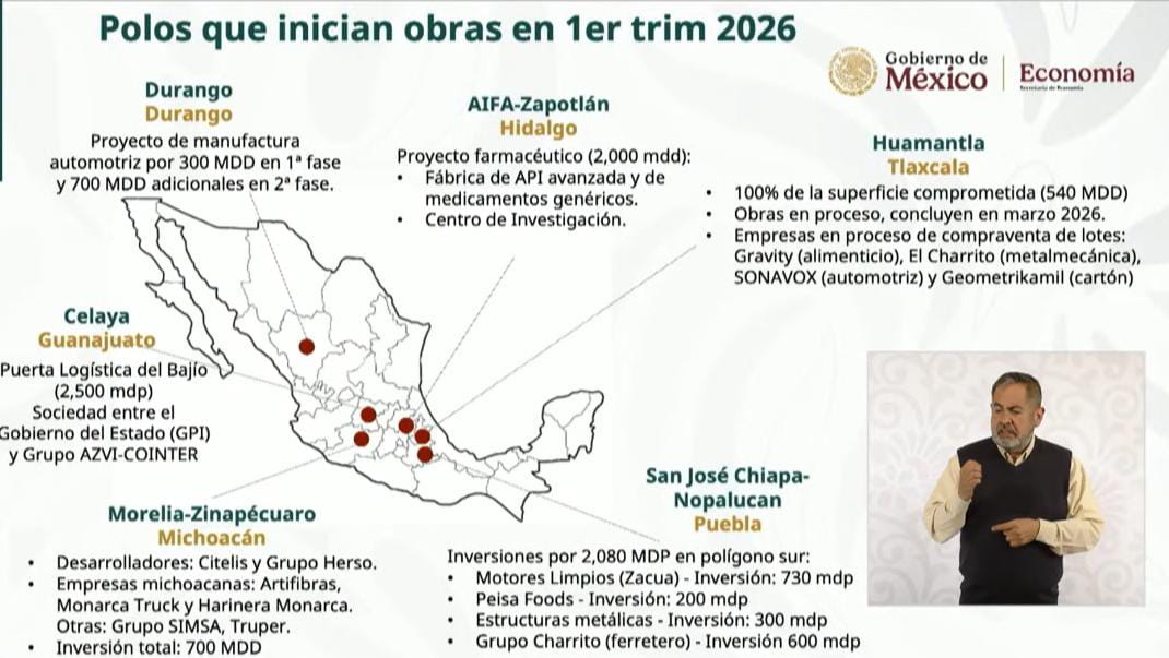 El funcionario federal informó que el Polo de Desarrollo de Huamantla ya tiene comprometido el 100 por ciento de su superficie, con una inversión estimada de 540 millones de dólares, lo que posiciona a Tlaxcala como un punto estratégico para la atracción de capital productivo y la generación de empleos.