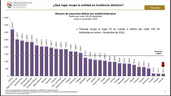 Mientras, al comparar de enero a noviembre de 2025, Tlaxcala se ubica en el sitio 32, con el menor número de delitos de todo el país, con 161.5.