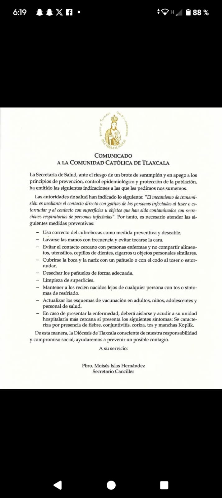 «A la comunidad católica de Tlaxcala, la Secretaría de Salud, ante el riesgo de un brote de sarampión y en apego a los principios de prevención, control epidemiológico y protección de la población, ha emitido las siguientes recomendaciones a las que les pedimos nos sumemos».