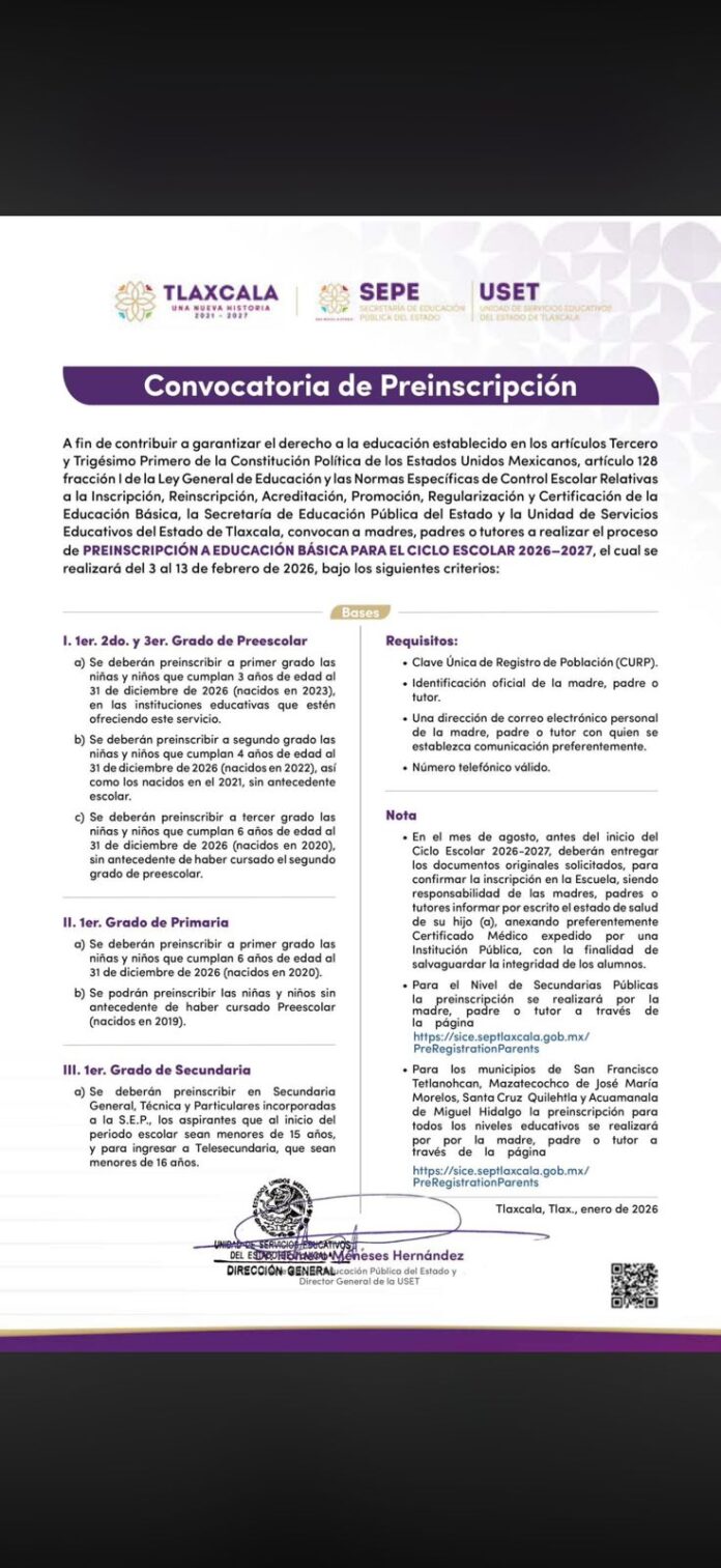 De acuerdo a lo establecido en el calendario escolar, la Secretaría de Educación Pública del Estado y la Unidad de Servicios Educativos del Estado de Tlaxcala (SEPE–USET) iniciaron con el proceso de preinscripción de nuevo ingreso al nivel básico para el ciclo escolar 2026–2027, a realizarse del 3 al 13 de febrero del año en curso.