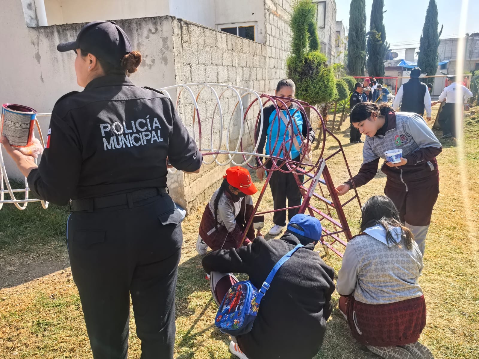 Los trabajos consistieron en limpieza general de la zona, así como pintura en diversas estructuras clásicas como columpios, resbaladillas y escaleras, además de aplicación de pintura en guarniciones y señalética en reductores de velocidad.