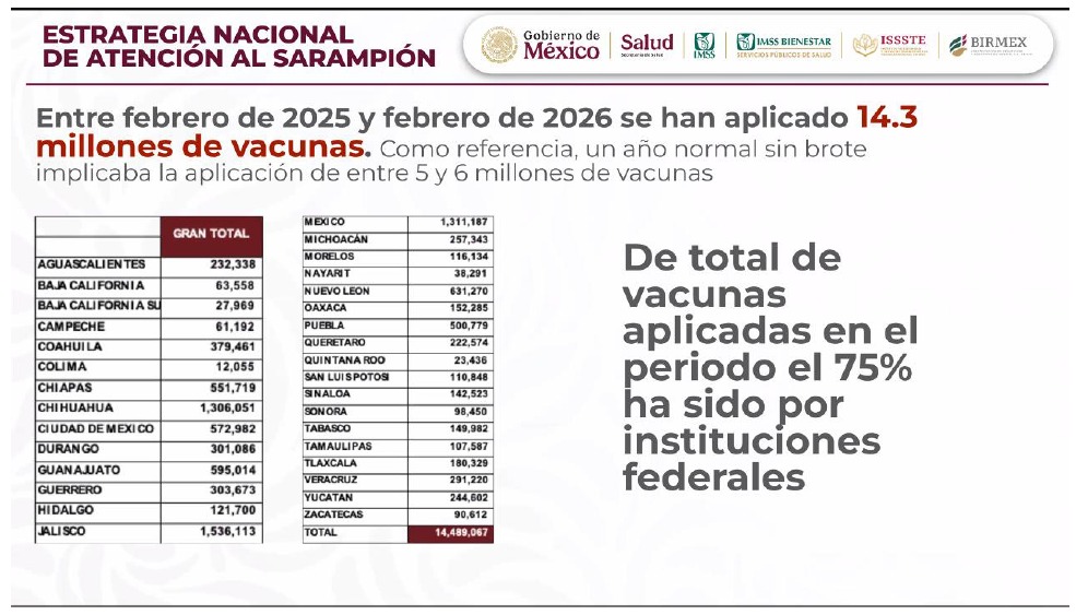 Por otra parte, se dio a conocer que, al momento, se cuenta con 28 millones de vacunas disponibles para la Estrategia Nacional de Atención al Sarampión, y adicionalmente 18.4 millones de vacunas se encuentran en proceso de distribución para la semana del 9 de febrero y la semana del 16 de febrero. En el caso de Tlaxcala, se distribuyeron 35 mil 581 dosis en total.