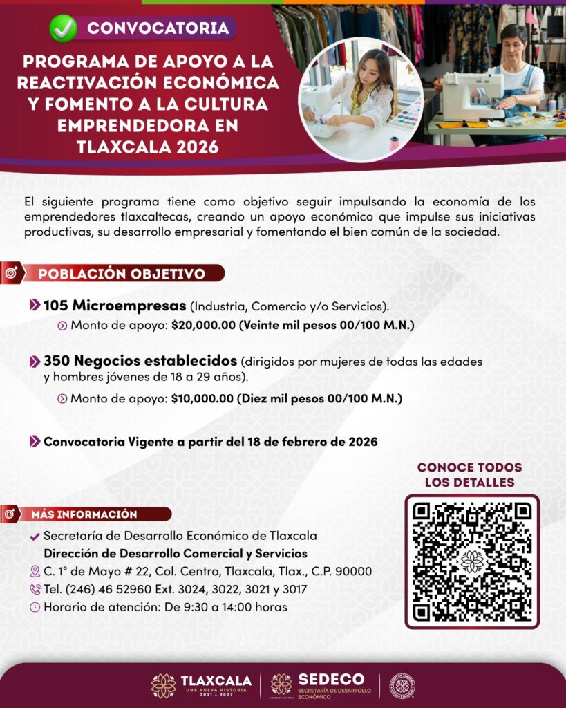 La convocatoria inicia a partir de este 18 de febrero hasta agotar los recursos disponibles y las y los interesados podrán consultar requisitos y realizar su registro a través de la página oficial de la dependencia o acudir directamente a las oficinas de la Sedeco, ubicadas en el centro de Tlaxcala.