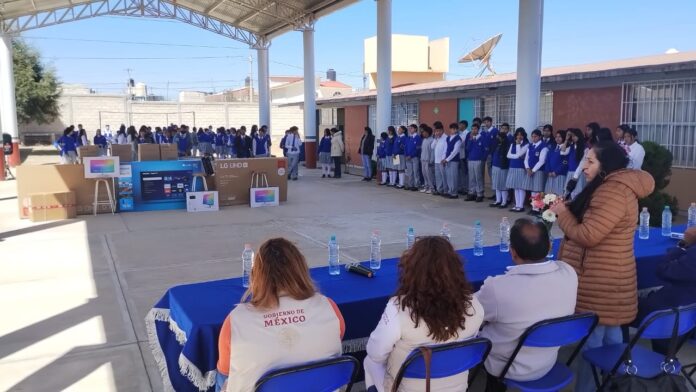 Mientras en la Telesecundaria Alfonso Espejel Dávila (Calpulalpan, 183 alumnos): recibieron 250 mil pesos* para 29 equipos de cómputo para aula de medios, mobiliario, pantallas, dosificadores de agua, instrumentos musicales