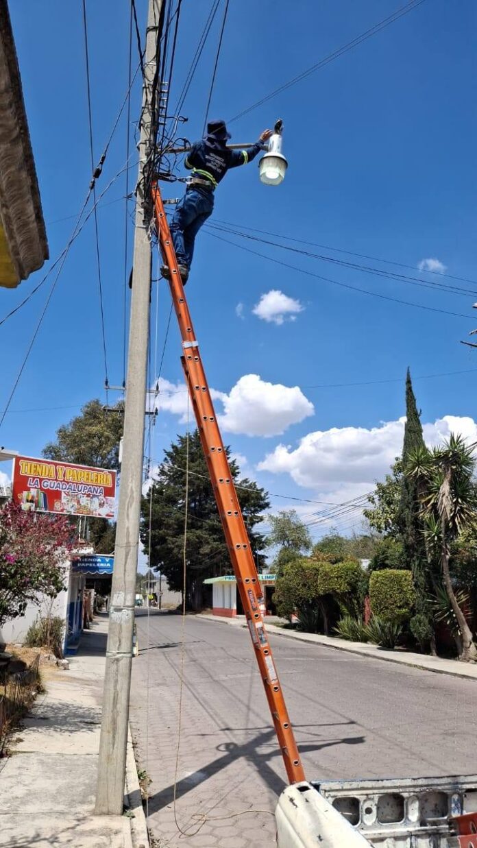 En la Segunda Sección de Yauhquemehcan la Brigada de Alumbrado Público lleva a cabo trabajos de mantenimiento en la red de iluminación.