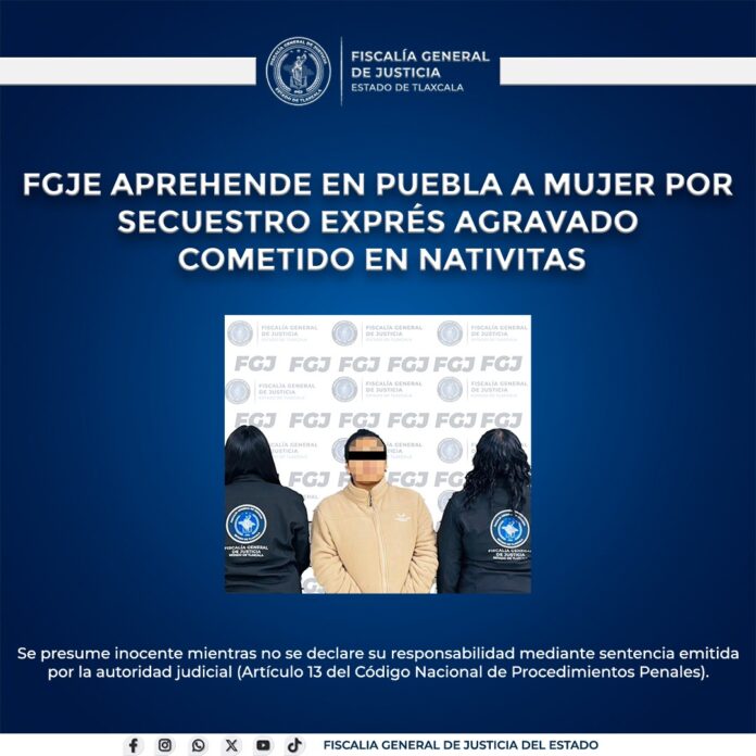 FGJE APREHENDE EN PUEBLA A MUJER POR SECUESTRO EXPRÉS AGRAVADO COMETIDO EN NATIVITAS